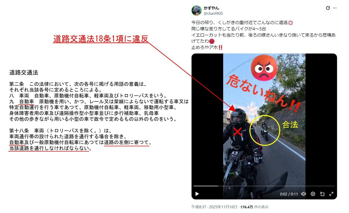 言いがかりが酷すぎる。 左側追い抜きは「違法」だし、前方のバイクを抜くときはイエローカットに近い状態(体が出ていたよ)だったし。 そもそも、相手に危険だって思わせる行為をしている事を棚に上げて批評するのは、人としてどうかしている。 x.com/woodymorita/st…